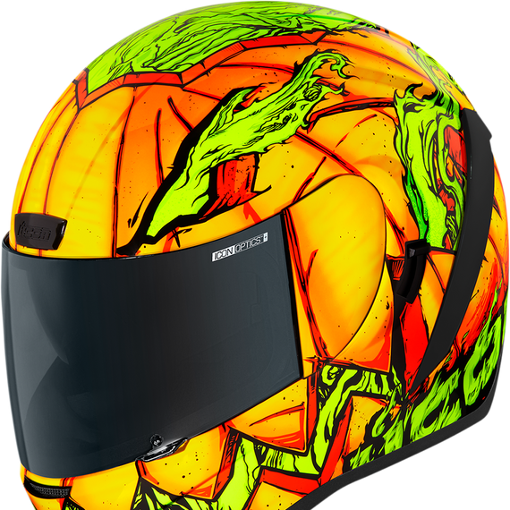 Caracteristicas: Internal airflow geometry Injection molded polycarbonate shell for strength Prolock™ positive shield locking system Sculpted neck roll Continuous venting system Fog-free ICON Optics™ Shield with Rapid-Release™ System Removable Hydradry™ 3-piece moisture wicking liner The Dropshield™ visor must only be used while the main face shield is in the fully closed position Removable molded breath deflector Internal Dropshield™ with exterior switch Internal speaker pockets work with ICON's R.A.U. Bluetooth device Includes Clear & Dark Smoke ICON Optics™ Shield