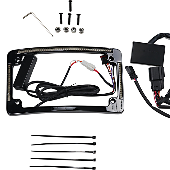 Caracteristicas: Low profile aluminum radius (12 degree curvature) horizontal license plate frame 20 amber LEDS on each side 50 dual intensity red LEDs are flush mounted on each side and function as run, brake, and turn ( some applications only function as run/turn) Plug & play installation Mounting hardware included Confirm license plate mounting bracket before purchasing. OEM mounting bracket may need to be modified or changed for radius license plate frame to mount properly. Plate frame requires 12 degree curved mounting.