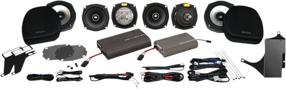Caracteristicas: Complete dual amp, 425-watt/6 speaker kit Includes XL Series front and, rear speakers and 7” woofer kit for the (vented) fairing lower glove boxes 200 Watt REV 450-AA to power front and rear speakers, and REV 225-AA 225 watt amp for 7” woofers Both amps fit inside fairing, are bolt-in and 100% plug-n-play Designed to work with factory charging system–no upgrade required Kit comes complete with all plug and play wiring and hardware to complete the installation