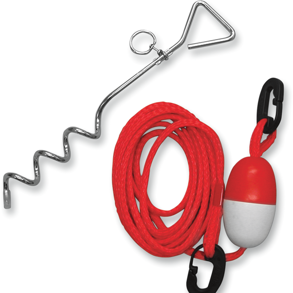 Caracteristicas: Includes 15' polypropylene rope, float and two plastic snap hooks Galvanized steel anchor stake spirals into ground Not for use in sandy soils