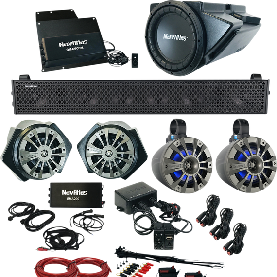 Caracteristicas: Kit includes Rocker switch bluetooth control 27” 10-speaker soundbar with built-in 200W class D amplifier 6-1/2” 200W RMS full-range Class-D amplified roll-cage speaker system 2 6-1/2" kick panel 200 Watts RMS speakers with an amplifier 10” 300W subwoofer and enclosure system w/ amplifier and dual amplifier bracket Digital-to-digital cable for connecting amplifier to speakers Installation kit with 60A circuit breaker IP66 rated