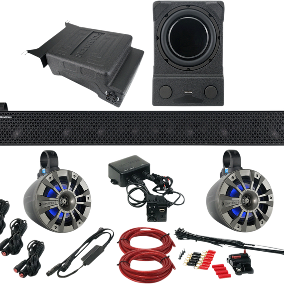 Caracteristicas: Rocker switch bluetooth control 35” 12-speaker amplified soundbar 6-1/2” amplified roll-cage speaker system 10” amplified under-seat subwoofer (driver) 10” passive under-seat subwoofer (passenger) Digital-to-digital connecting cable Digital-to-digital Y adapter Installation kit with 60A circuit breaker Digital-to-digital cable for connecting amplifier to speaker