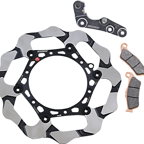 Caracteristicas: Kit includes a 270 mm floating disk Batfly® Aluminum series rotor and bracket for OEM caliper and a set of sintered CM46 pads The brake rotor's outer track mounts to the carrier at six points; both the carrier and the rivets are aluminum instead of stainless steel, which reduces weight The carrier is made of aluminum AL7075 T-6 like the rivets; this allows for optimal shape, reduced weight and higher rigidity