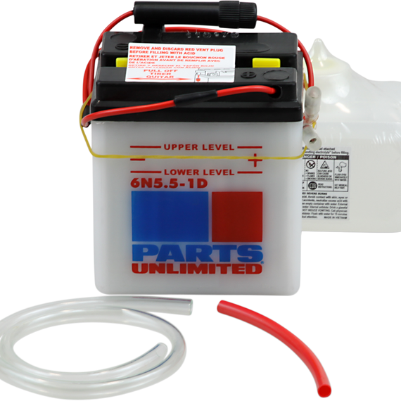 • Kit includes battery, pre-measured acid pack, red filler tube, hardware kit and clear vent tube