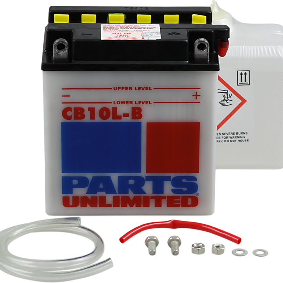 • Kit includes battery, pre-measured acid pack, red filler tube, hardware kit and clear vent tube