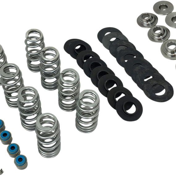 Caracteristicas: Made from premium stress-relieved conical ovate wire Feature extremely high-level of fatigue life Use a much smaller and lighter weight retainer to reduce valve weight and create quicker rev and smoother motion Designed to handle the demands of performance engines with 585" and smaller lift camshafts Kits include: Econo BeeHive® valve springs, lightweight 7° steel retainers, machined heat-treated chromoly spring seats, seat shims, valve locks and a set of premium Viton® valve seals equipped with spring-loaded valve stem wiper system Seat lbs./installed height; 183 lbs. at 1.770" (0.510" lift), 175 lbs. at 1.795" (0.535" lift), 172 lbs. at 1.813" (0.553" lift), 165 lbs. at 1.835" (0.574" lift), 160 lbs. at 1.845" (0.585" lift), 380 lbs. at 1.260" OPEN HEIGHT coil bind at 1.190" Dyno proven and track tested Feuling® BeeHive® valve springs must be installed at the correct OPEN HEIGHT, matching max lift to the open height spec of the valve springs Made in the U.S.A. Econo BeeHive® kits are direct replacement with no machining or rocker box clearance required for cams up to .574" lift for 84-04 Big Twin and 86-03 XL and up to .585" lift for 05-17 Twin Cam.