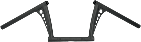 Caracteristicas: Add period-style bobber ape-hanger handlebars to your ride Bars are knurled, slotted and drilled for internal wiring Stylish multi-hole drilled corner gussets offer strength and rigidity Hand TIG welded Feature chrome billet end caps Not for throttle-by-wire applications Made in the U.S.A.