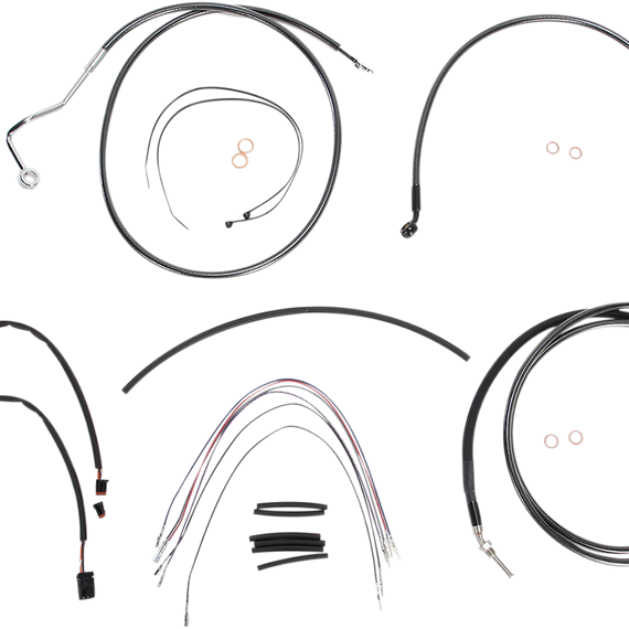 Caracteristicas: Reuses existing lower brake line The only complete kits with matching braided cables and brake lines Kits include throttle and idle cables of throttle-by-wire extensions, clutch cable or hydraulic clutch line, brake lines, copper crush washers, hardware, and any necessary switch wiring of turn signal extension All cable and brake lines feature Black Pearl braid with highly polished black chrome plated fittings All cables are a low-effort, high-efficiency design that meets or exceeds all OE specifications for fitment, construction, endurance Kits for dual disc models include an all brazed manifold that eliminates leaks, alignment problems and unattractive threaded connections Assembled in the U.S.A. Kits are based on using ape hanger style handlebars with 2” risers