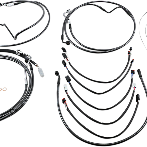 Caracteristicas: The only complete kits with matching braided cables and brake lines Kits include throttle and idle cables of throttle-by-wire extensions, clutch cable or hydraulic clutch line, brake lines, copper crush washers, hardware, and any necessary switch wiring of turn signal extension All cables are a low-effort, high-efficiency design that meets or exceeds all OE specifications for fitment, construction, endurance Kits for dual disc models include an all brazed manifold that eliminates leaks, alignment problems and unattractive threaded connections Assembled in the U.S.A. Kits are based on using ape hanger style handlebars with 2” risers
