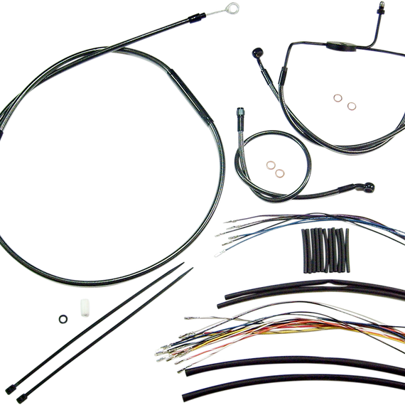 • Kits include throttle and idle cables of throttle-by-wire extensions, clutch cable or hydraulic clutch line, brake lines, copper crush washers, hardware, and any necessary switch wiring of turn signal extension