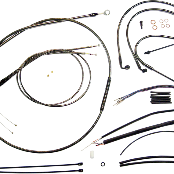 Caracteristicas: The only complete kits with matching braided cables and brake lines Kits include throttle and idle cables of throttle-by-wire extensions, clutch cable or hydraulic clutch line, brake lines, copper crush washers, hardware, and any necessary switch wiring of turn signal extension All cables are a low-effort, high-efficiency design that meets or exceeds all OE specifications for fitment, construction, endurance Kits for dual disc models include an all brazed manifold that eliminates leaks, alignment problems and unattractive threaded connections Assembled in the U.S.A. Kits are based on using ape hanger style handlebars with 2” risers
