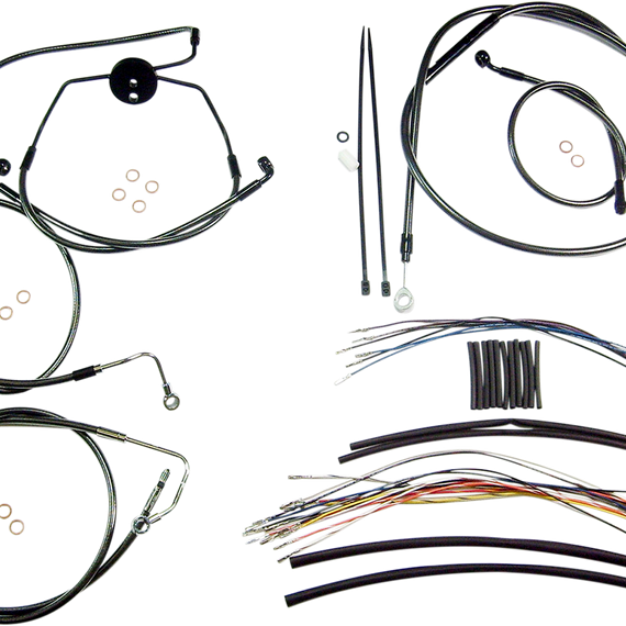 Caracteristicas: The only complete kits with matching braided cables and brake lines Kits include throttle and idle cables of throttle-by-wire extensions, clutch cable or hydraulic clutch line, brake lines, copper crush washers, hardware, and any necessary switch wiring of turn signal extension All cables are a low-effort, high-efficiency design that meets or exceeds all OE specifications for fitment, construction, endurance Kits for dual disc models include an all brazed manifold that eliminates leaks, alignment problems and unattractive threaded connections Assembled in the U.S.A. Kits are based on using ape hanger style handlebars with 2” risers