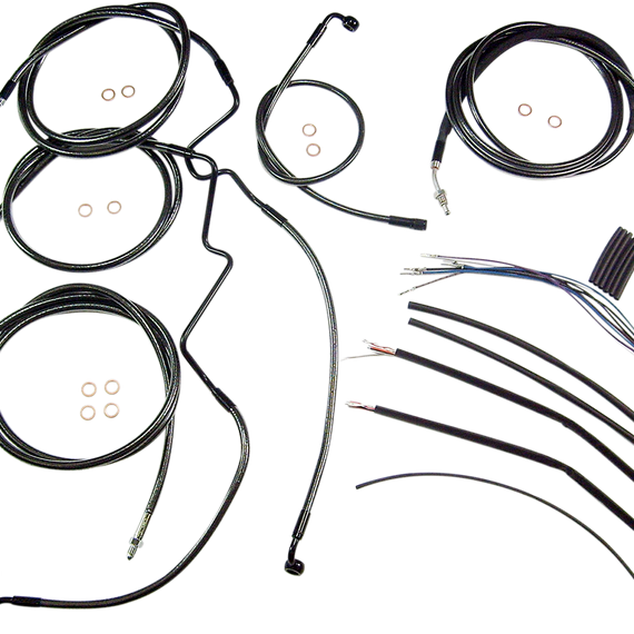 Caracteristicas: The only complete kits with matching braided cables and brake lines Kits include throttle and idle cables of throttle-by-wire extensions, clutch cable or hydraulic clutch line, brake lines, copper crush washers, hardware, and any necessary switch wiring of turn signal extension All cables are a low-effort, high-efficiency design that meets or exceeds all OE specifications for fitment, construction, endurance Kits for dual disc models include an all brazed manifold that eliminates leaks, alignment problems and unattractive threaded connections Assembled in the U.S.A. Kits are based on using ape hanger style handlebars with 2” risers