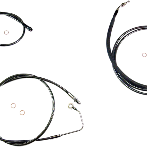 Caracteristicas: Reuses existing lower brake line The only complete kits with matching braided cables and brake lines Kits include throttle and idle cables of throttle-by-wire extensions, clutch cable or hydraulic clutch line, brake lines, copper crush washers, hardware, and any necessary switch wiring of turn signal extension All cable and brake lines feature Black Pearl braid with highly polished black chrome plated fittings All cables are a low-effort, high-efficiency design that meets or exceeds all OE specifications for fitment, construction, endurance Kits for dual disc models include an all brazed manifold that eliminates leaks, alignment problems and unattractive threaded connections Assembled in the U.S.A. Kits are based on using ape hanger style handlebars with 2” risers