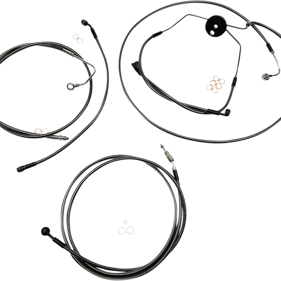 Caracteristicas: The only complete kits with matching braided cables and brake lines Kits include throttle and idle cables of throttle-by-wire extensions, clutch cable or hydraulic clutch line, brake lines, copper crush washers, hardware, and any necessary switch wiring of turn signal extension All cables are a low-effort, high-efficiency design that meets or exceeds all OE specifications for fitment, construction, endurance Kits for dual disc models include an all brazed manifold that eliminates leaks, alignment problems and unattractive threaded connections Assembled in the U.S.A. Kits are based on using ape hanger style handlebars with 2” risers