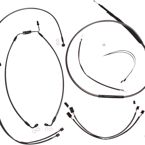 Caracteristicas: The only complete kits with matching braided cables and brake lines Kits include throttle and idle cables of throttle-by-wire extensions, clutch cable or hydraulic clutch line, brake lines, copper crush washers, hardware, and any necessary switch wiring of turn signal extension All cables are a low-effort, high-efficiency design that meets or exceeds all OE specifications for fitment, construction, endurance Kits for dual disc models include an all brazed manifold that eliminates leaks, alignment problems and unattractive threaded connections Assembled in the U.S.A. Kits are based on using ape hanger style handlebars with 2” risers