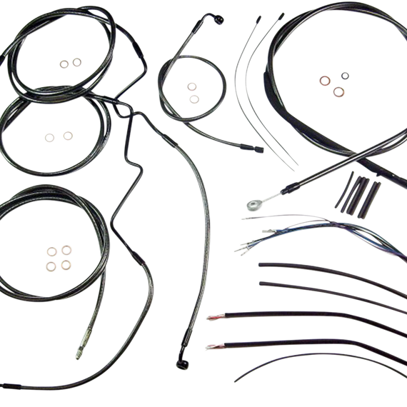 Caracteristicas: The only complete kits with matching braided cables and brake lines Kits include throttle and idle cables of throttle-by-wire extensions, clutch cable or hydraulic clutch line, brake lines, copper crush washers, hardware, and any necessary switch wiring of turn signal extension All cables are a low-effort, high-efficiency design that meets or exceeds all OE specifications for fitment, construction, endurance Kits for dual disc models include an all brazed manifold that eliminates leaks, alignment problems and unattractive threaded connections Assembled in the U.S.A. Kits are based on using ape hanger style handlebars with 2†risers