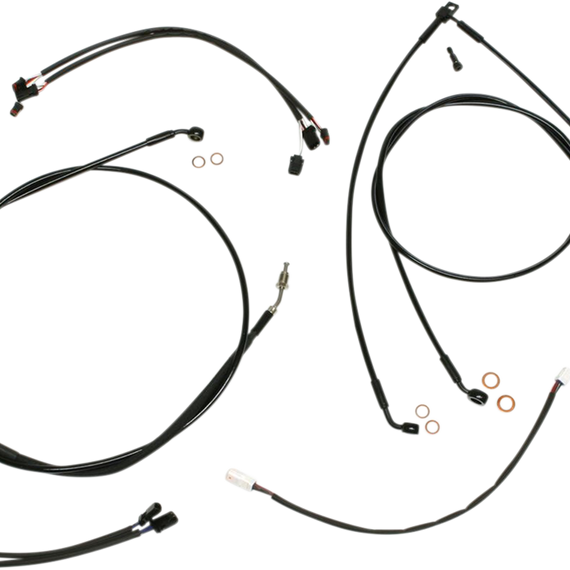 Caracteristicas: Magnum XR Handlebar Installation Kits offer a great fit and excellent quality at an economical price Kit features highly polished, chrome plated fittings All cables are a low effort, high efficiency design that meets or exceeds all OE specifications for fitment, construction, endurance Magnum XR Brake Lines use an enhanced construction of heavy gauge stainless steel embedded in tough abrasion resistant nylon outer jacket for superior durability and extreme braking response for safe riding The coating on cables and brake lines offers exceptional protection for paint or chrome Kits that include manifolds use an all brazed construction to ensure optimal OE fitment and appearance Manifolds use -3 AN connections for an easy installation Kits include throttle and idle cables or throttle-by-wire extensions, clutch cable or XR hydraulic clutch line, XR brake lines, copper crush washers, hardware, turn signal and switch wiring extensions Kits are based on using ape hanger style handlebars and 2" risers.