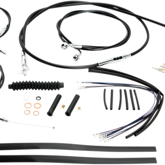 Caracteristicas: Magnum XR Handlebar Installation Kits offer a great fit and excellent quality at an economical price Kit features highly polished, chrome plated fittings All cables are a low effort, high efficiency design that meets or exceeds all OE specifications for fitment, construction, endurance Magnum XR Brake Lines use an enhanced construction of heavy gauge stainless steel embedded in tough abrasion resistant nylon outer jacket for superior durability and extreme braking response for safe riding The coating on cables and brake lines offers exceptional protection for paint or chrome Kits that include manifolds use an all brazed construction to ensure optimal OE fitment and appearance Manifolds use -3 AN connections for an easy installation Kits include throttle and idle cables or throttle-by-wire extensions, clutch cable or XR hydraulic clutch line, XR brake lines, copper crush washers, hardware, turn signal and switch wiring extensions Kits are based on using ape hanger style handlebars and 2" risers.
