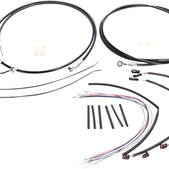 Caracteristicas: Magnum XR Handlebar Installation Kits offer a great fit and excellent quality at an economical price Kit features highly polished, chrome plated fittings All cables are a low effort, high efficiency design that meets or exceeds all OE specifications for fitment, construction, endurance Magnum XR Brake Lines use an enhanced construction of heavy gauge stainless steel embedded in tough abrasion resistant nylon outer jacket for superior durability and extreme braking response for safe riding The coating on cables and brake lines offers exceptional protection for paint or chrome Kits that include manifolds use an all brazed construction to ensure optimal OE fitment and appearance Manifolds use -3 AN connections for an easy installation Kits include throttle and idle cables or throttle-by-wire extensions, clutch cable or XR hydraulic clutch line, XR brake lines, copper crush washers, hardware, turn signal and switch wiring extensions Kits are based on using ape hanger style handlebars and 2" risers.
