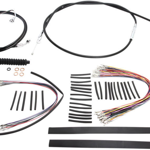 Caracteristicas: Magnum XR Handlebar Installation Kits offer a great fit and excellent quality at an economical price Kit features highly polished, chrome plated fittings All cables are a low effort, high efficiency design that meets or exceeds all OE specifications for fitment, construction, endurance Magnum XR Brake Lines use an enhanced construction of heavy gauge stainless steel embedded in tough abrasion resistant nylon outer jacket for superior durability and extreme braking response for safe riding The coating on cables and brake lines offers exceptional protection for paint or chrome Kits that include manifolds use an all brazed construction to ensure optimal OE fitment and appearance Manifolds use -3 AN connections for an easy installation Kits include throttle and idle cables or throttle-by-wire extensions, clutch cable or XR hydraulic clutch line, XR brake lines, copper crush washers, hardware, turn signal and switch wiring extensions Kits are based on using ape hanger style handlebars and 2" risers.