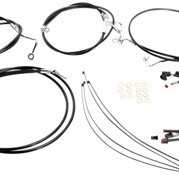 Caracteristicas: Magnum XR Handlebar Installation Kits offer a great fit and excellent quality at an economical price Kit features highly polished, chrome plated fittings All cables are a low effort, high efficiency design that meets or exceeds all OE specifications for fitment, construction, endurance Magnum XR Brake Lines use an enhanced construction of heavy gauge stainless steel embedded in tough abrasion resistant nylon outer jacket for superior durability and extreme braking response for safe riding The coating on cables and brake lines offers exceptional protection for paint or chrome Kits that include manifolds use an all brazed construction to ensure optimal OE fitment and appearance Manifolds use -3 AN connections for an easy installation Kits include throttle and idle cables or throttle-by-wire extensions, clutch cable or XR hydraulic clutch line, XR brake lines, copper crush washers, hardware, turn signal and switch wiring extensions Kits are based on using ape hanger style handlebars and 2" risers.