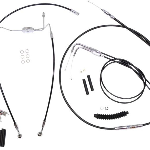 Caracteristicas: Magnum XR Handlebar Installation Kits offer a great fit and excellent quality at an economical price Kit features highly polished, chrome plated fittings All cables are a low effort, high efficiency design that meets or exceeds all OE specifications for fitment, construction, endurance Magnum XR Brake Lines use an enhanced construction of heavy gauge stainless steel embedded in tough abrasion resistant nylon outer jacket for superior durability and extreme braking response for safe riding The coating on cables and brake lines offers exceptional protection for paint or chrome Kits that include manifolds use an all brazed construction to ensure optimal OE fitment and appearance Manifolds use -3 AN connections for an easy installation Kits include throttle and idle cables or throttle-by-wire extensions, clutch cable or XR hydraulic clutch line, XR brake lines, copper crush washers, hardware, turn signal and switch wiring extensions Kits are based on using ape hanger style handlebars and 2" risers.