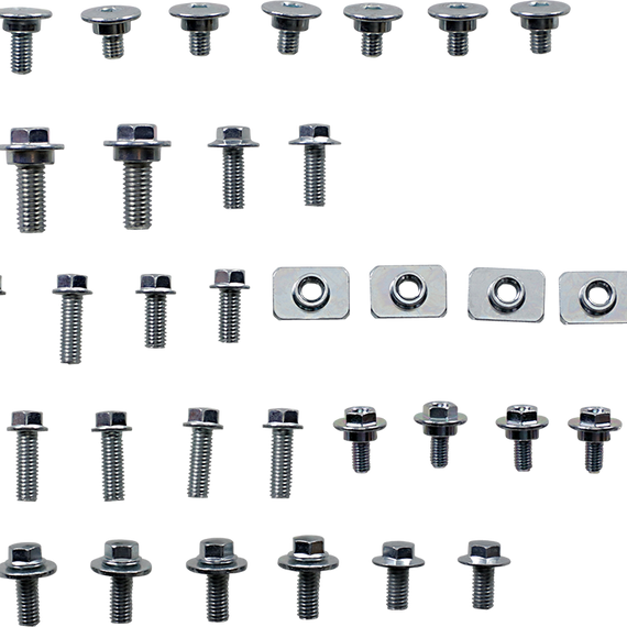 • Include bolts for front and rear fenders, fork guards, front number plates, seats, side panels and radiator shrouds