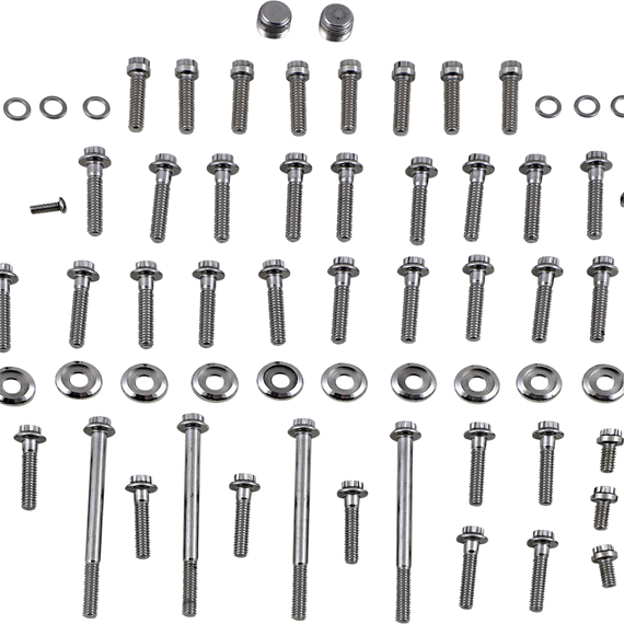 Caracteristicas: Hand-polished stainless steel engine kits are designed to provide a custom and detailed look with easy installation Five groups of fasteners will detail all your engine covers with a lasting shine Diamond Engineering's special hex flange rocker box bolts are included for Twin Cam models Includes fasteners for primary, inspections and inner primary; cam and points; oil pump or oil line cover, filter mount and sensors (Dyna and Touring models) or oil filter plugs and sensors (Softail Twin Cam); lifter blocks; and rocker boxes Made in the U.S.A.
