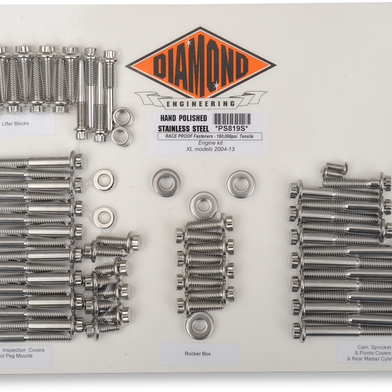 Caracteristicas: Hand-polished stainless steel engine kits are designed to provide a custom and detailed look with easy installation Five groups of fasteners will detail all your engine covers with a lasting shine Diamond Engineering's special hex flange rocker box bolts are included for Twin Cam models Includes fasteners for primary, inspections and inner primary; cam and points; oil pump or oil line cover, filter mount and sensors (Dyna and Touring models) or oil filter plugs and sensors (Softail Twin Cam); lifter blocks; and rocker boxes Made in the U.S.A.