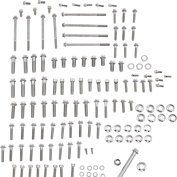 Caracteristicas: Customize a bike without having to completely disassemble it Groups of polished stainless steel fasteners covering the engine, transmission and the most visible areas of the motorcycle Kits add detail and a custom look with ease Kits include fasteners for primary, inspections and inner primary; cam and points; oil pump or oil line cover, filter mount and sensors (Dyna and Twin Cam FLHT) or oil filter plugs and sensors (Softail Twin Cam); lifter blocks; rocker box; coil and circuit breaker covers (Dyna); transmission side cover; oil filler (FLHT models); transmission top cover; handlebar clamp, switch housings and master cylinder; front fender or front fender trim and fuel tank (FLHT models); rear fender rail or swingarm pivot blocks and rear floorboard brackets (FLHT models) Made in the U.S.A.