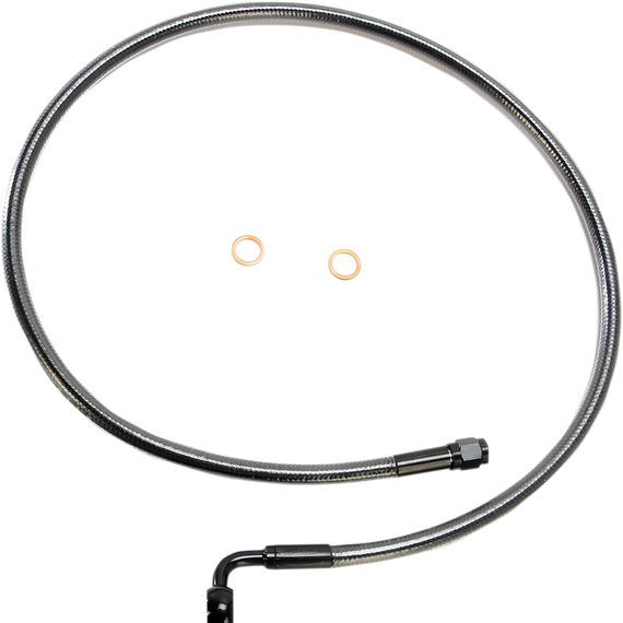 Caracteristicas: Manufactured with an enhanced construction designed to be compatible with Harley-Davidson ABS requirements for stock and alternate length brake lines - designed to follow the same routing path as OEM lines Brake kits consist of a direct fit lower assembly used in conjunction with alternative length upper lines Braid color and weave match all MAGNUM control cables and brake lines - Crystal clear outer jacket offers exceptional protection against scuffing paint or chrome and will never discolor Brake lines are constructed with PTFE inner tubing, DuPont™ Kevlar® aramid fiber, premium Signature Magnum braids and an outer PVC jacket to greatly reduce line expansion Upper, lower, mid brake line and adapter kits are sold separately to for a perfect fit. Compliant with all DOT FMVSS-106 requirements Assembled in the U.S.A. DuPont™ and Kevlar® are trademarks or registered trademarks of E.I. du Pont de Nemours and Company. Single disc Dyna and Sportster models use two kits – one upper and one lower. Softail models utilize 3 kits (except '18+ dual disc), with the lower being optional on all. Upper kits are required for handlebar changes; by using either an upper brake line adapter or for '11 - '17 Softail models, the optional ABS Lower Brake Line Kit which includes the adapter. Adapter for Softail models allows the upper brake line to complete the connection from the ABS controller ('11 - '17) or lower brake line ('18+) to the master cylinder If replacing the stock lower brake line assembly on '18+ dual disc Softails, an adapter is NOT needed. Using AN-3 fittings, the upper line connects directly to the Magnum lower assembly Dual disc Touring models use three kits - one upper, one lower and one mid-line. Trike models use two kits - one upper and one mid-line. No lower is available. A Designer mid-line and upper line is required for all Touring and Trike models with ABS. The mid-line connects to the upper brake line in the fairing or nacelle and completes the routing from the master cylinder to the ABS controller. A lower kit is optional. Non-stock applications require taking a measurement for upper brake line length and banjo angle to ensure correct fitment (see How to Order) Harley-Davidson motorcycles equipped with ABS (anti-lock brake system) require ABS specific upper and lower brake line kits.  Failure to do so may result in compromised anti-lock braking ability.  Magnum Shielding upper brake line kits manufactured specifically for these applications are identified with the letters “ABS” printed directly on the brake hose. Upper line length for Softail, Dyna, and '14+ Sportster models is determined by using your stock OE master cylinder brake line as a guide. Pull the rubber boot back and measure from the point at which the soft, flexible line enters the crimp collar on the lower portion. Follow the brake line routing up to your master cylinder. (see diagrams below) '18+ Softail – Upper line replacement when reusing the stock lower brake line. (adapter required) Lengths are determined by using the stock master cylinder line for a guide. Measure from the lower brake line manifold where the upper line attaches, up to the master cylinder.  From that measurement subtract 1.5” for the adapter and round up to the next number to determine upper line length. (see diagram below) '18+ Softail Single Disc Upper and Lower line replacement requires an adapter. (3 kits) Adapter is NOT needed when replacing both the Upper and Lower '18+ Softail Dual Disc brake lines. (2 Kits) The upper line connects directly to the Magnum Designer dual disc lower brake line. Follow the above instruction without subtracting 1.5” for the adapter. Rounded up, the length measured will be correct. Upper line length for Touring and Trike models is measured using the 49" mid-line as a reference to determine additional line length needed to complete the routing from the ABS controller to the master cylinder. That measurement will be your upper line length.