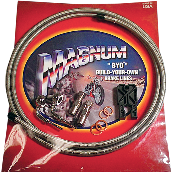Caracteristicas: Compatible Magnum Shielding BYO® brand brake hose and BYO® components have been specifically designed to only work in conjunction with each other Kits contain all components needed to build one complete stock or custom brake line Brake hose and fittings are DOT labeled, pressure tested and 100% inspected All BYO® brand brake lines are intended for non-ABS applications ONLY Assembles in 5 minutes with only side cutters and 7/16" wrench