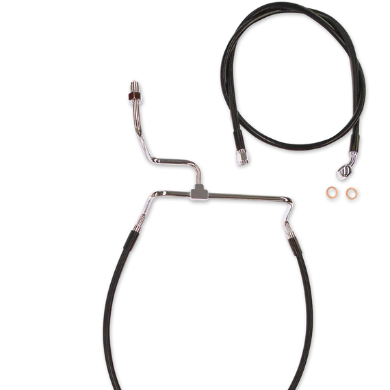 Caracteristicas: Manufactured with an enhanced construction for extreme braking response and durability Designed to be compatible with Harley-Davidson® ABS requirements for stock and alternate length brake lines Inner PTFE tubing braided with XR Stainless Steel reinforcement embedded in a tough Nylon outer jacket offers exceptional protection for paint or chrome All fittings are highly polished and chrome plated All brazed manifold construction eliminates leaks, alignment problems, and unattractive threaded connections for a sleek appearance AN-3 connections for easy installations Assembled in the U.S.A. Complete kits contain brake line assemblies to connect the caliper(s) to the master cylinder All non-ABS kits are complete kits Dyna and Sportster ABS kits are complete and include an upper and lower brake line Touring, Trike and Softail ABS brake line kits are available separately as upper and lower kits (except '18+ Softail FXFB, which is a complete kit) ABS lower kits are optional and do not require an upper line for installation ABS upper kits contain a brake line assembly with any needed adapters to connect the ABS controller or lower brake line assembly to the master cylinder. A lower brake line assembly is not required