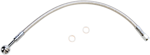 Caracteristicas: Brake kits utilize a superior two-piece design consisting of a direct fit lower assembly used in conjunction with alternative length upper lines All brazed manifold construction eliminates leaks, alignment problems, and unattractive threaded connections for a sleek appearance Inner PTFE tubing braided with aramid reinforcement provides the ultimate in high performance by greatly reducing line expansion AN-3 connections for easy installations Made in the U.S.A. Alternative fitments: Due to handlebar changes, fitment options are accommodated with the UPPER line only. You may prefer to use a different length or banjo angle based your specific routing. Upper line length is determined by measuring the routing path from the top of the lower triple tree to the master cylinder. The upper and lower connection is made at this point. Non-stock applications require taking a measurement for the upper brake line length and banjo angle to ensure correct fitment. Non-ABS Models - one upper and lower kit is required - two kits per bike.