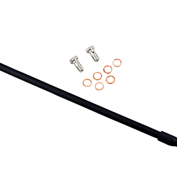 Caracteristicas: 64 braided strands of steel around the line, making the line have zero expansion at any time - better than any other braided line Requires less pressure at the lever, allowing the rider to use less force while stopping the bike faster and with better feel Fittings come from the factory pre-positioned but can swivel 180° if necessary to make the installation process easier Include a clear outer coating which protects the bike from scratches and the lines from humidity Complete with all necessary banjo bolts and washers Ready to install