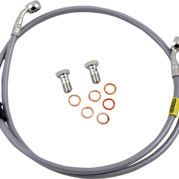 Caracteristicas: 64 braided strands of steel around the line, making the line have zero expansion at any time - better than any other braided line Requires less pressure at the lever, allowing the rider to use less force while stopping the bike faster and with better feel Fittings come from the factory pre-positioned but can swivel 180° if necessary to make the installation process easier Include a clear outer coating which protects the bike from scratches and the lines from humidity Complete with all necessary banjo bolts and washers Ready to install