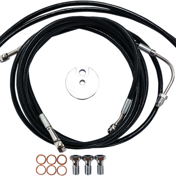 • Include black vinyl throttle and idle cables (except 08-16 Dressers), black vinyl clutch cable/clutch line and black stainless brake lines with chrome fittings, banjo bolts and crush washers