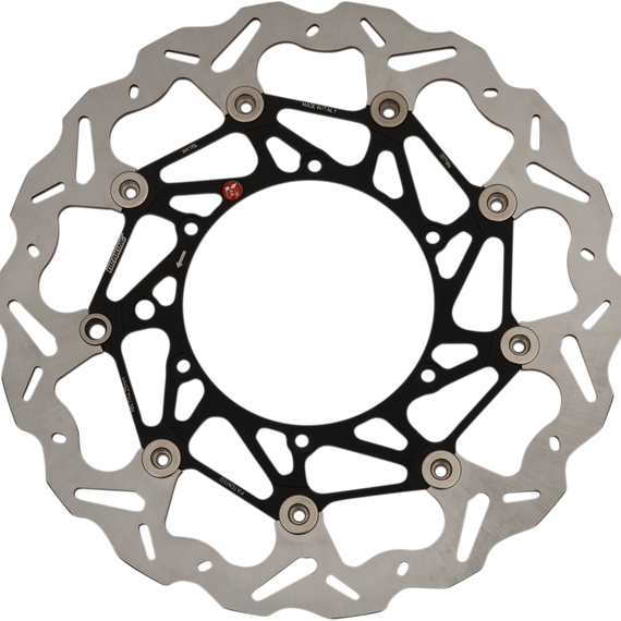 Caracteristicas: Outer and inner diameter of the disk have a non-round design that enables better radial expansion of the rotor under extreme heat conditions Piercing holes are replaced by edges specifically designed to improve brake pad performance Floating disk with steel carrier OEM diameter; directional design for left or right side