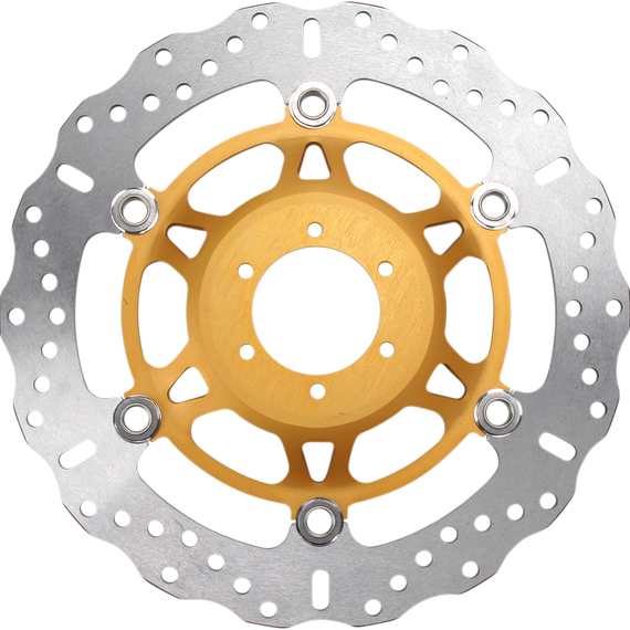 Caracteristicas: Floating brake disc with radical, profiled contour brake rotor ring Brake disc design reduces weight and increases brake effect Brake disc center hubs are forged aluminum Rotor construction uses high-friction billet steel Universal left- or right-side application
