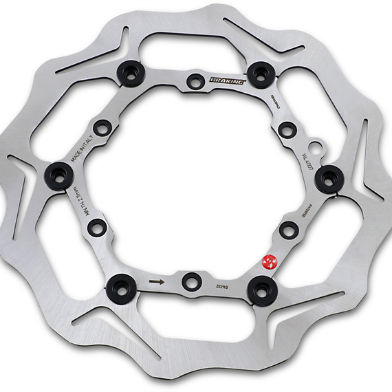 Caracteristicas: Outer and inner diameter of the disk have a non-round design that enables better radial expansion of the rotor under extreme heat conditions Piercing holes are replaced by edges specifically designed to improve brake pad performance Floating disk with steel carrier OEM diameter; directional design for left or right side