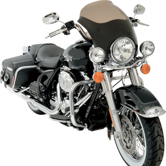 Caracteristicas: Bold aerodynamic shape adds custom style and increases rider comfort Looks like a two-piece but is actually a strong, one-piece fairing constructed of high-impact aircraft-grade Lucite Provides full torso coverage to virtually eliminate wind fatigue, while allowing an unobstructed view of the countryside "Factory" finish looks great as is or can easily be painted to really achieve the next level of custom Custom fit, model-specific mounting kits feature Memphis Shades exclusive Trigger-Lock mounting system - on and off without tools or if you already have a Memphis Fats/Slim windshield, Sportsshield or Gauntlet Fairing simply purchase a plate-only mount kit to mount the fairing