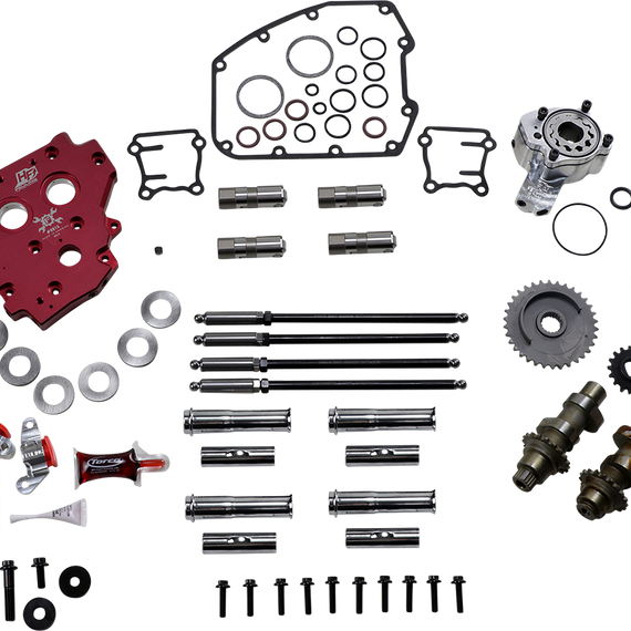 Caracteristicas: All necessary components from top-to-bottom of the camchest Provide maximum reliability, longevity, peak performance, and the coolest engine and oil temperatures obtainable Quieter and smoother engine operation Increase oil pressure, scavenge volume and engine oil flow 25-35 degree cooler engine temperatures 15-30 degree cooler oil temperatures 15-30 more PSI of oil pressure Eliminate wet sumping, blow by and oily air cleaners Heavy-duty Fast Install adjustable pushrods can be installed without removing top rocker covers Includes Feuling® HP+® high-volume oil pump, high-flow billet cam plate, REAPER® Series camshafts, HP+® hydraulic roller lifters, Fast Install® adjustable pushrods, Timken®/Koyo® bearings, gaskets, O-rings, hardware, ARP® fasteners, washers, moly lube and Loctite® Conversion chain drive kits update early mechanical-style tensioner systems to the new late-style hydraulic tensioner chain drive system; these kits utilize conversion Reaper® camshafts which have 99-06 inner-cam journals matched with 07-17 outer-cam journals, allowing the use of the 07-17 cam plate and hydraulic chain drive tensioner system; hydraulic chain drive components purchased separately Installation of gear drive cams will require separate purchase of S&S or Andrews 4-gear drive kit