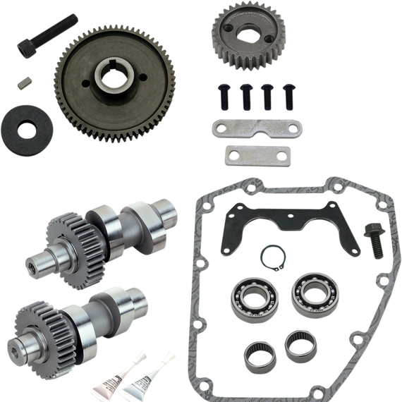 Caracteristicas: Camshaft gear drive kits increase valve timing accuracy by eliminating timing chain lash and loosely-fit stock chain drive Reverses the rear cam's direction of rotation, providing additional operating clearance between cam lobes; as a result, higher cam lifts are possible with the gear drive kit Kits include cams, inner gears, outer drive gears, inner and outer bearings, gasket and instructions Material must be removed from the inner surface of the stock gear cover to install S&S gear drive cams A hydraulic press and other professional-level tools are required to install these kits Cam bearings and gaskets must be replaced when installing new cams Kits require high-performance valve springs when installed in 99-04 models. Installer must check coil bind, valve-to-valve clearance and valve-to-piston clearance. Due to the inherent characteristics of gear drives, you may experience more valve train noise. Installer must check coil bind, valve-to-valve clearance and valve-to-piston clearance. Bolt-in cam for 103” and 106” Big Bore Twin Cam motors Use with stock heads (up to 10.2 compression) and low restriction intake and exhaust Great for lighter bikes with strong power from 3500-6000 rpm Made in the U.S.A.