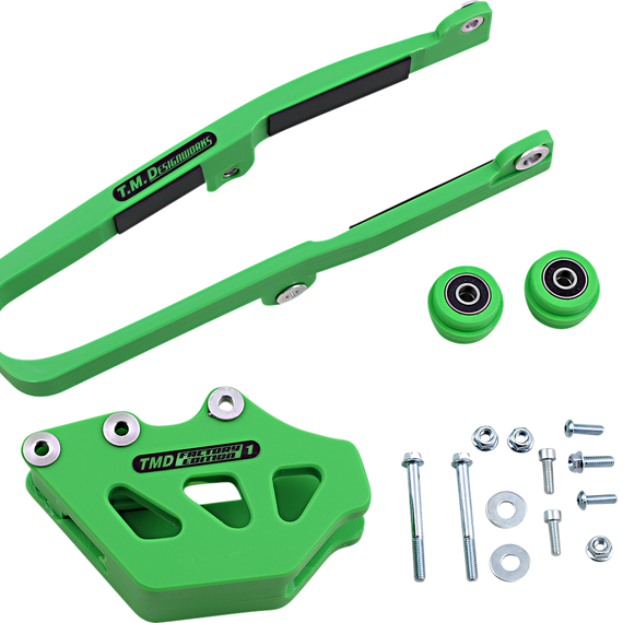 Caracteristicas: The kit includes front slider, lower frame pad & FE #2 rear guide with replaceable wear pad. Noise dampening pad system lowers chain slap noise. A special chain guidance backing plate keeps the chain constantly centered to improve suspension. The lower Powerlip frame pad last longer but more importantly lowers surface drag.