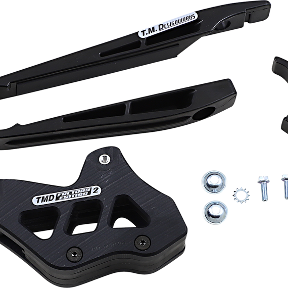 Caracteristicas: The kit includes front slider, lower frame pad & FE #2 rear guide with replaceable wear pad. Noise dampening pad system lowers chain slap noise. A special chain guidance backing plate keeps the chain constantly centered to improve suspension. The lower Powerlip frame pad last longer but more importantly lowers surface drag.