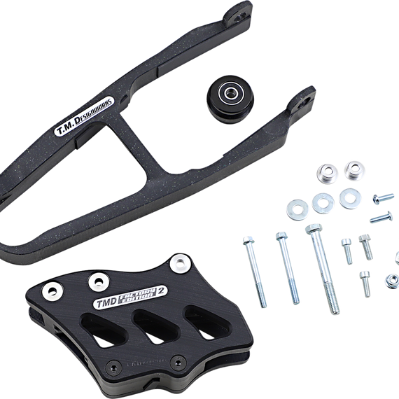 Caracteristicas: The kit includes front slider, lower frame pad & FE #2 rear guide with replaceable wear pad. Noise dampening pad system lowers chain slap noise. A special chain guidance backing plate keeps the chain constantly centered to improve suspension. The lower Powerlip frame pad last longer but more importantly lowers surface drag.