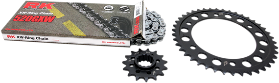 Caracteristicas: Kits includes a premium Driven® C45 steel alloy black case hardened rear sprocket paired with Driven® C45 steel case hardened and quenched front sprocket RK’s 520 Steel Quick Acceleration Race Kit combines the enhanced performance of race gearing and durability of steel components Kit includes a one-tooth-smaller-than-OE front sprocket