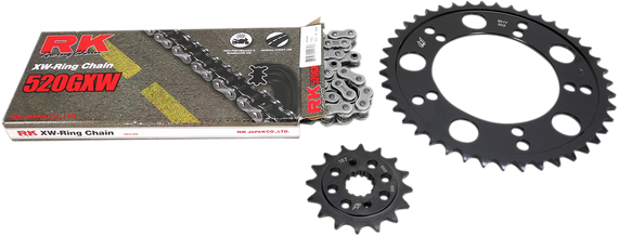 Caracteristicas: Kits includes a premium Driven® C45 steel alloy black case hardened rear sprocket paired with Driven® C45 steel case hardened and quenched front sprocket RK’s 520 Steel Quick Acceleration Race Kit combines the enhanced performance of race gearing and durability of steel components Kit includes a one-tooth-smaller-than-OE front sprocket