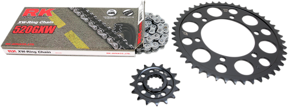 Caracteristicas: Kits includes a premium Driven® C45 steel alloy black case hardened rear sprocket paired with Driven® C45 steel case hardened and quenched front sprocket RK’s 520 Steel Quick Acceleration Race Kit combines the enhanced performance of race gearing and durability of steel components Kit includes a one-tooth-smaller-than-OE front sprocket